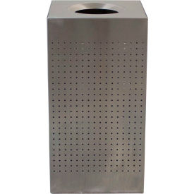 SQUARE ONE-PIECE RECEPTACLE WITH HINGED LID AND PERFORATED PATTERN IS PERFECT FOR HOSPITALITY AND HOTEL VENUES, SUITES IN ARENAS AND STADIUMS, CLASS A OFFICE PARKS AS WELL AS ANYWHERE HIGH-END STYLE AND FUNCTIONALITY ARE NEEDED. COMES WITH RETAINER BANDS TO HOLD BAG LINERS IN PLACE. FEATURES