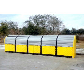 SAFELY STORE MULTIPLE DRUMS OUTDOORS. EXTENDER KITS ARE AVAILABLE TO EXPAND CAPACITY BEYOND 20 DRUMS. ALL POLYETHYLENE CONSTRUCTION OFFERS EXCELLENT CHEMICAL RESISTANCE, WILL NOT RUST OR CORRODE. SEPARATE, LOCKABLE COMPARTMENTS FEATURE A UNIQUE "2-WAY" ENTRY SYSTEM - ALLOWS QUICK ACCESS TO ALL FOUR (4) DRUMS. ROLL-TOP COVERS CAN BE EASILY LIFTED FROM WAIST HEIGHT TO ACCESS DRUM TOPS. SWING-OUT DOORS PROVIDE SAFETY AND CONVENIENCE FOR LOADING OR UNLOADING DRUMS. LOW-PROFILE (8-3/4" HEIGHT) CONTAINMENT PALLET POSITIONS DRUM-TOPS AT A SAFE, CONVENIENT LEVEL TO POUR WASTES INTO FUNNELS OR TO USE DRUM PUMPS. RUGGED, 9,000 LB. UNIFORMLY DISTRIBUTED LOAD (UDL) CAPACITY PER COMPARTMENT ALLOWS SAFE STORAGE OF IBC TANKS AS WELL AS DRUMS. UNITS SHIP PARTIALLY UNASSEMBLED FOR FREIGHT SAVINGS. MEETS EPA CONTAINER STORAGE REGULATION 40 CFR 264.175 AND HELPS COMPLY WITH NPDES, 40 CFR 122.26 (1999). CONSIDERED A STORMWATER MANAGEMENT "BEST MANAGEMENT PRACTICE" PRODUCT (BMP). ALSO MEETS SPCC REGULATIONS. 5 YEAR LIMITED WARRANTY.