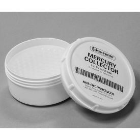 TO COLLECT SPILLED MERCURY QUICKLY, JUST UNSCREW THE LID WITH THE FOAM PAD, AND PRESS PAD FIRMLY ONTO THE SPILL. THIS PRESSURE FORCES THE MERCURY INTO THE PAD. WHEN THE LID IS SCREWED BACK ONTO THE JAR, THE PAD IS COMPRESSED AGAINST THE JAR'S FREESTANDING PERFORATED PLATE, RELEASING THE MERCURY INTO THE JAR BOTTOM. FEATURES: