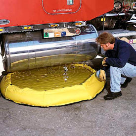 POP UP POOLS INSTANTLY EXPAND TO CAPTURE LEAKS FROM SADDLE TANKS, PIPES, HYDRAULIC LINES AND MANY OTHER INDUSTRIAL INCIDENTS. TO OPERATE THE SPRUNG STEEL MODELS, SIMPLY REMOVE THEM FROM THEIR PROTECTIVE CARRYING CASE, GIVE THEM A QUICK SHAKE AND THEY AUTOMATICALLY POP UP - THEY INSTANTLY EXPAND AND ARE READY FOR RESPONSE TO ANY EMERGENCY. UNIQUE, PATENTED DESIGN FOAM RING RISES WITH LEVEL OF LIQUID TO RAISE SIDEWALLS. COMPACT FOLDED SIZE STORES EFFICIENTLY INSIDE SPILL KITS; HANDLES ON STORAGE BAG CAN ALSO BE USED TO HANG ON A WALL NEAR SHIPPING/RECEIVING DOCKS. EXCELLENT CHEMICAL RESISTANCE, INCLUDING DIESEL FUEL, ANTIFREEZE, ACIDS, CAUSTICS AND CORROSIVES. HELPS MINIMIZE ENVIRONMENTAL DAMAGE AND RELATED CLEAN-UP COSTS. EXCELLENT FOR RESPONSE TO DAMAGED SADDLE TANKS AND CROSS-OVER LINES, HAZMAT SPILLS, LEAKING CONTAINERS, MACHINERY AND PIPING. OTHER APPLICATIONS INCLUDE USE AS A DECONTAMINATION POOL AND COLLECTION POOL FOR SOILED SORBENTS. NOTE: STORAGE BAGS ARE INCLUDED WITH SPRUNG STEEL MODELS ONLY.